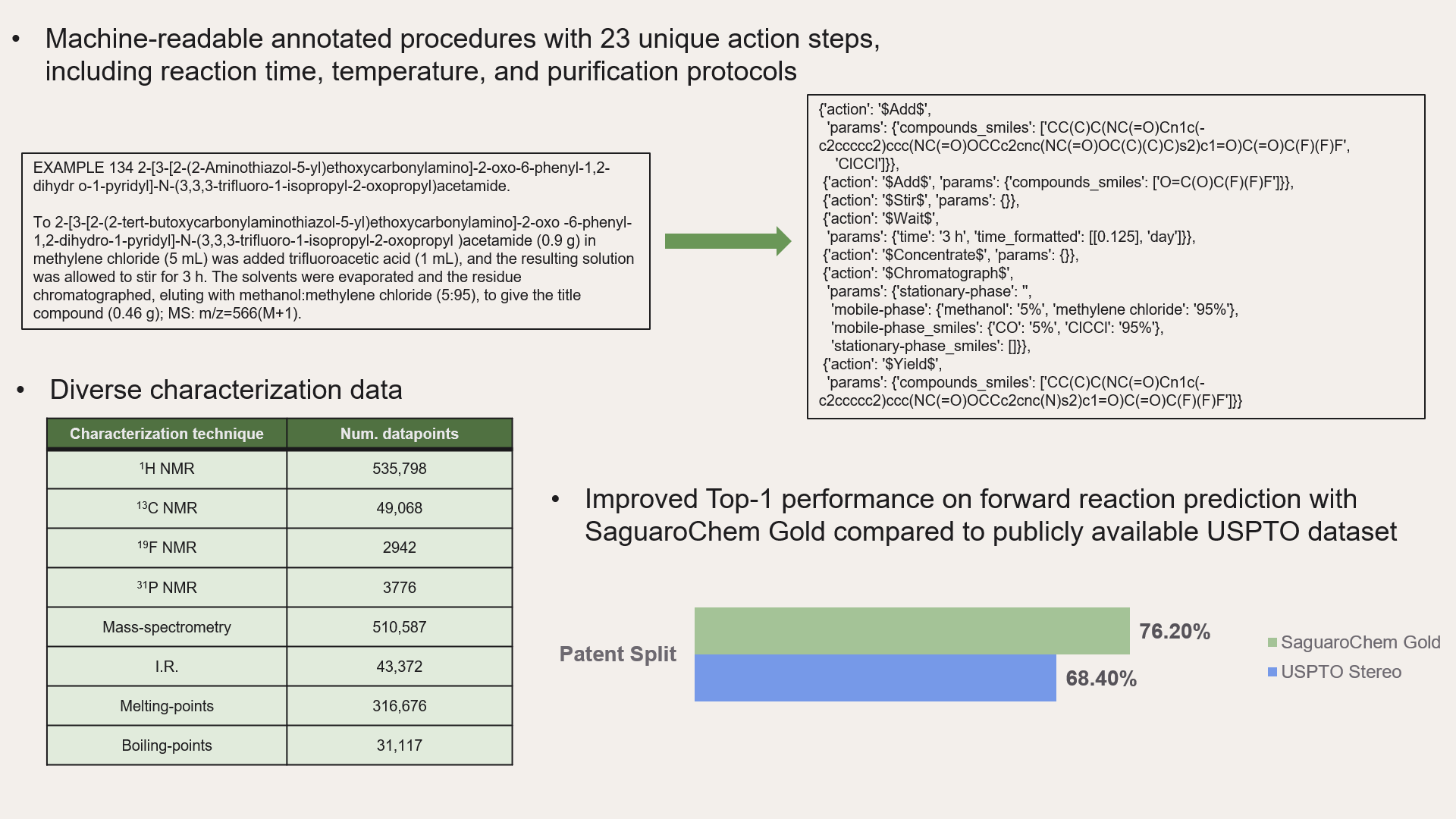 See what’s possible with the SaguaroChem dataset – check out our demos for forward reaction prediction, procedure retrosynthesis prediction, purification protocol prediction, and more